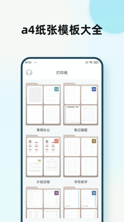 a4纸是一款提供纸张模板的软件!更好的帮助你在工作生活、学习娱乐中开始自己的计划!连接打印机即可打印纸张,也可以导出pdf到笔记软件中记笔记。