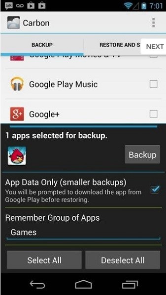 2、Android 上的 Helium 氦备份会显示出你手机上的应用列表,在 APP 列表中勾选你想要备份数据的 APP,然后点击「Backup」开始备份。