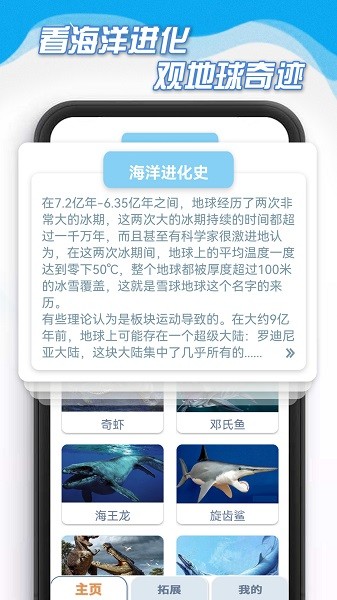 海底百科是一款全面学习海洋相关知识的软件。在这里,你可以学习生命在海洋中的演化过程,还可以了解海底的生物、地形等知识。在海底百科,全面了解海洋,提高自己对海洋的认识。