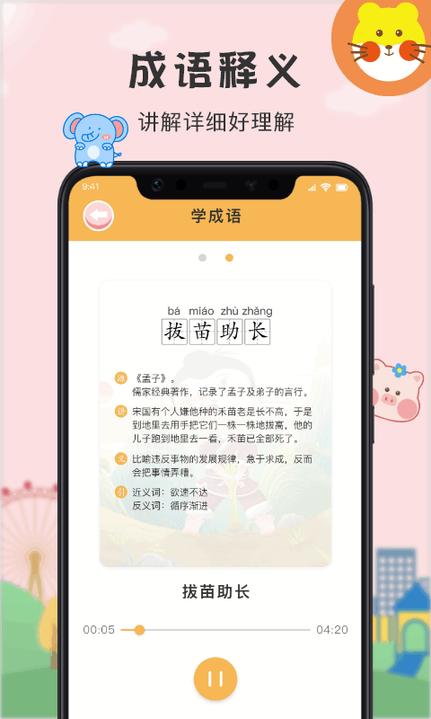 1.软件还提供了很多趣味的成语故事,帮助孩子进行国学的启蒙。