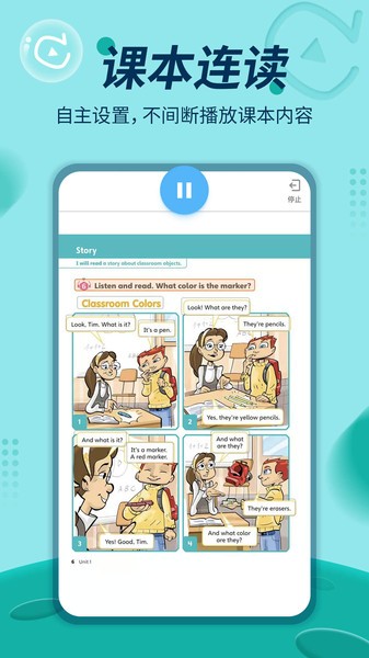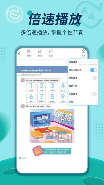 电子点读书支持连读,自主设置连读起始点,不间断播放课本内容,轻轻松松磨耳朵