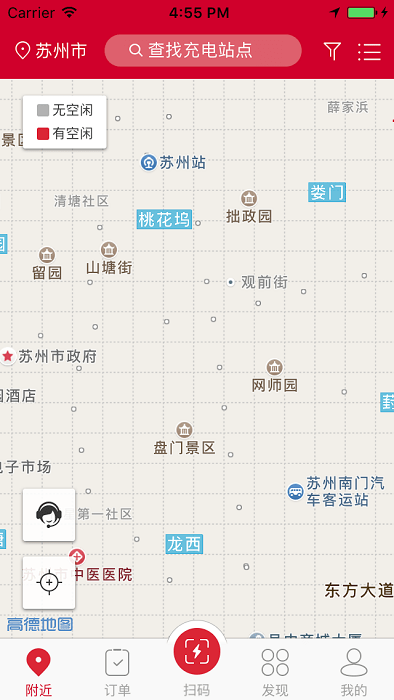 3、进入应用附近页面,实时定位查看附近充电桩的信息,选择有空闲的充电桩