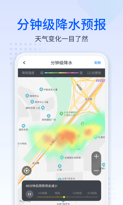 6、实时降雨预报:预报未来降水情况,分钟级别知晓降雨趋势