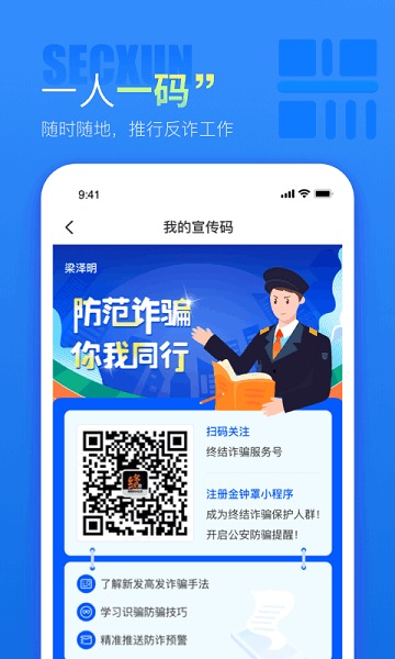 这个APP的特色挺多的,比如及时预防诈骗、一键举报、随时设置安全措施等等。亮点包括全国百万民警都在用、实时预警推送、海量诈骗案例分析、还有“一人一码”的功能。应用优势也很明显,支持多种拦截分类,还能自定义黑名单自动拦截,过滤诈骗短信和彩信,智能识别诈骗性质,打造安全防护。