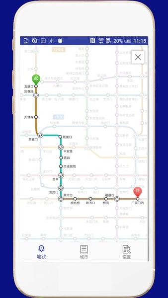 查看全国主要城市的地铁线路图和站点数据,支持设置起点和终点以后计算换乘方案。
