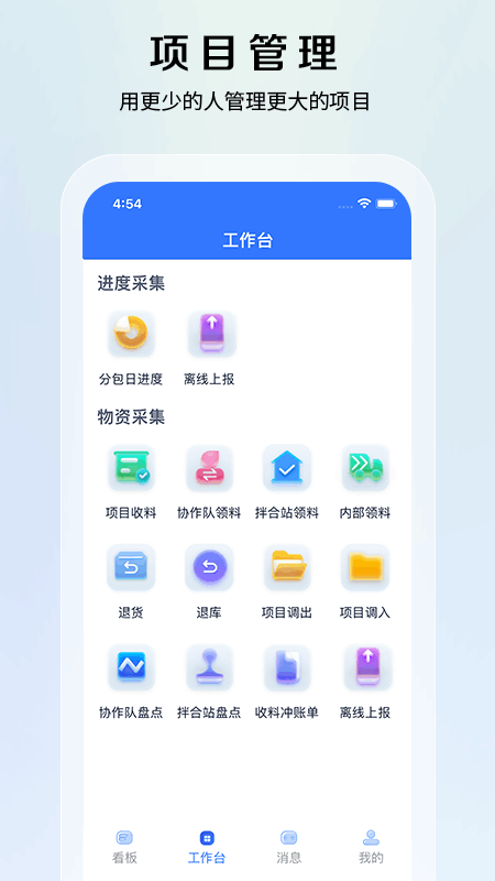 工作台:包括分包进度、物资库存管理,工程数据采集,以及在网络环境条件差的环境下离线上报;