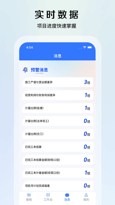 项管通app最新版可以查看详细的项目进度,能够便捷的进行项目和企业看板,非常适合用于进行工程管理,可以接收最新的预警消息,有非常详细的监管统计分析,可以在线录入项目信息和进行上报!