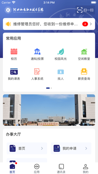 河北机电职业技术学院移动办公系统,采用iPhone等智能手持终端设备作为移动终端,通过校园内外、公共场所WiFi环境、移动运营商提供的GPRS、4G、5G等网络,接入学校的网络办公系统,使办公自动化系统的应用摆脱地理空间的约束,实现学校日常工作。通过课表校历、通知公告、会议日程、成绩报告等功能,带给师生不一样的使用体验。