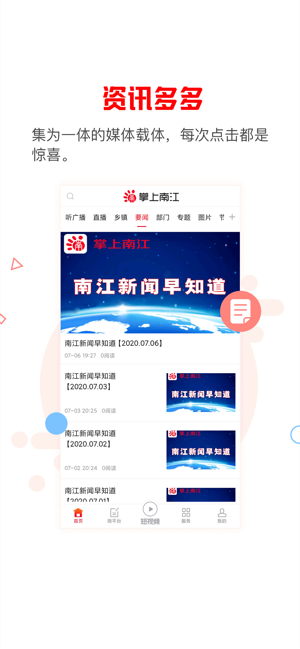 掌上南江最新版是一款专注南江当地新闻资讯app,实时更新最新的南江新闻和热点头条,精选推荐,支持看电视、听广播、看直播视频,图文结合,自由浏览阅读,掌握身边大小事,还提供丰富的便民服务,政务生活等你体验,使用方便!