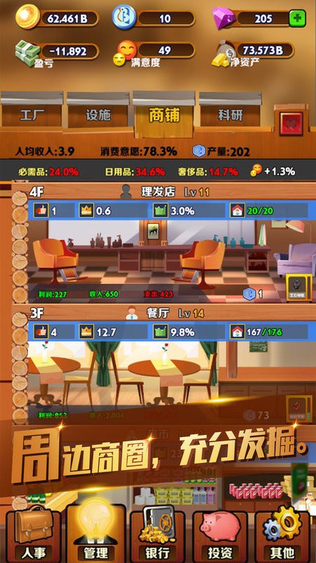 2、独特的养成游戏系统,生产从原材料到半成品再到成品,只要升级工厂并配备员工,即可自动生产及销售;