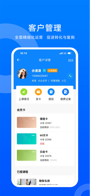 会籍模块:手机上完成跟进会员,发卡等操作,销售形式不局限。
