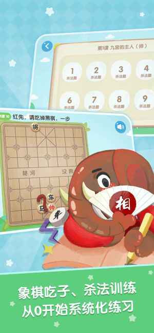 4、残局闯关: 专为少儿定制的闯关系统,提高孩子学棋兴趣。
