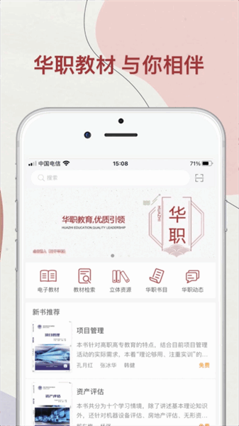 华职教材App包含电子教材、教材检索、立体资源、华职书目和华职动态五个模块。使用电子教材模块,可免费阅读近1000种教材的电子文件,方便师生选书和学习;选到教材后,可以在教材检索中搜索该种类教材,下载配套教学资源包,帮助教学;后续也可以在立体资源中,搜索相关优质微课,辅助学习;另外关注华职书目和华职动态,可以更方便、快捷地把握相关最新教材信息。