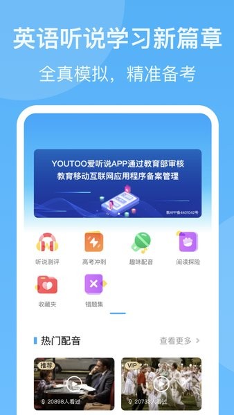 youtoo爱听说高中版软件是专为高中学生打造的英语听说训练app,能够在手机上进行听说测评,纠正错误发音,可以完成课后习题,题型丰富多样,可以根据自己的实际情况进行针对性训练,有非常丰富的电影纪录片以及音乐资源,支持进行趣味配音。