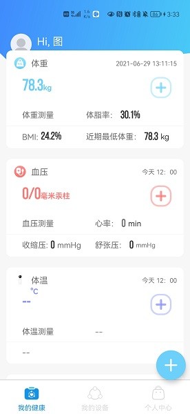 意泰健康结合智能体脂秤、智能血压计、智能额温仪等硬件测量设备使用,提供了记录体重,记录血压、记录体温等多项数据记录功能。帮助用户记录自己的体重、体脂、血压、心率、体温等健康数据,并为用户提高自己的身体健康水平提供参考依据。