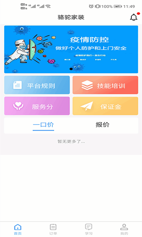 骆驼家装app平台师傅可以借助该软件来管理日常工作,每次接单都能在这个平台中及时跟进,可以极大程度上提高工作效率。订单状态能第一时间去跟进,有需要的工人可以来下载。