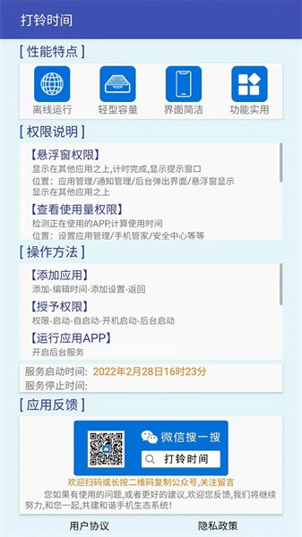 “打铃时间”主要致力于家长和孩子之间对手机应用App(尤其是游戏类)合理时间的安排,通过运行时间、间隔时间以及每天使用次数等设置,协调孩子玩手机的时间,培养小朋友自律、守时的好习惯,与家长和小朋友一起建立和谐的手机生态环境!