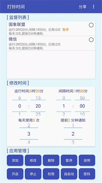 2、输入一个预期的使用时间,在这个时间过后该应用将无法使用,直至退出后再次开启;