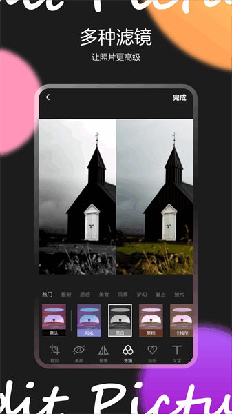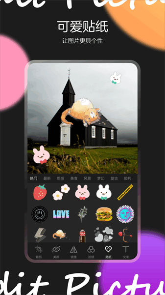 多种滤镜、贴纸供您选择,给你的照片添上一抹色彩。