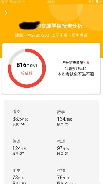 2、查看自己的排名、各科优劣势等,看哪些科目成绩比较高,内容简单易用;