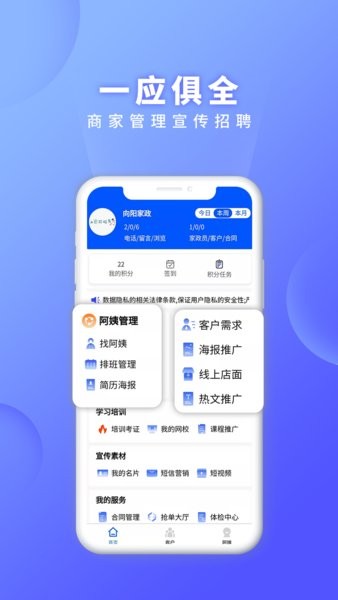 这款证书之家家政端手机软件主要是为家政企业商家设计的管理工具。它可以帮助商家在线制作宣传海报、抢单大厅接单、与客户沟通、管理阿姨信息以及提供线上培训等功能,让家政服务更高效便捷。