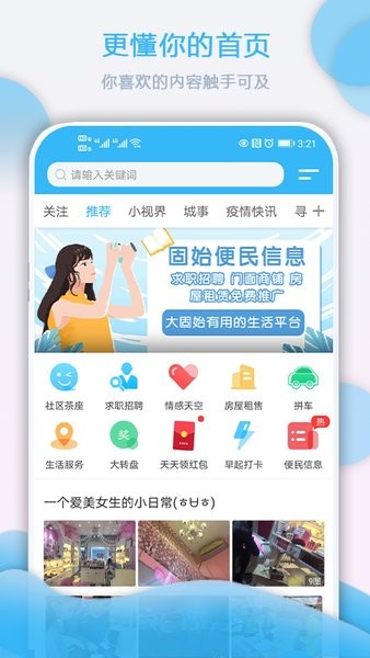 大固始app最新版是一个专为固始人打造的手机平台,里面啥都有,疫情信息、找工作、买房租房、打车拼车都能搞定。还有吃喝玩乐的信息,随时查看商家优惠,本地新闻资讯也能第一时间掌握,视频和文字内容应有尽有,同城的趣味短视频也挺有意思的。