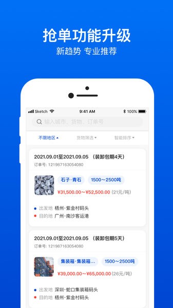 不用坐等运单,一键开启极速抢单,帮您快速匹配货源,随时随地,线上看价,筛选合适货源,高价运单不错过,省时省心!