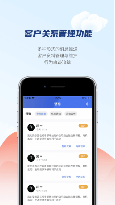 3、合作商家通过使用系统后,可以全程追踪客户的浏览行为,系统会根据客户行为数据分析出客户画像及意向度,支持对线索和客户快捷拨打电话、发消息、贴标签等客户管理操作,进而提高客户管理效率。