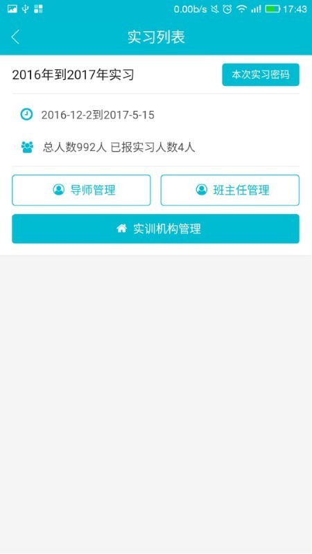 -- 实习管理:实习管理展现了学生从实习报到,到周报和实习报告的生成。