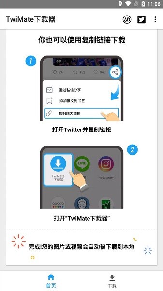 twimate下载器app是一款有关手机下载器的应用工具,可以支持下载各种视频图片,界面简单,体积小巧,一键粘贴链接地址进行识别即可下载,操作轻松易上手,还支持保存分享,内置相册、播放器,让用户可以直接在线浏览观看,方便又快捷!