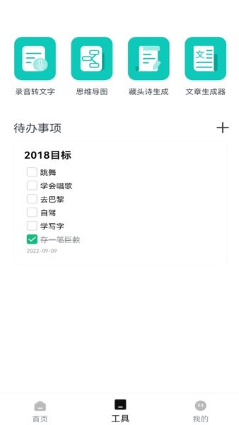 清单助手软件手机版支持在手机上做笔记、写日记和制作计划,适合的场景非常之广泛,能够设定各种目标,可以按照时间顺序有序完成,还提供了思维导图、录音转文字、藏头诗以及文章生成动众多实用的小工具。