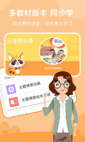 1、精彩的主题有声绘本,贴合三~六年级的学生教材,按主题情景学习。