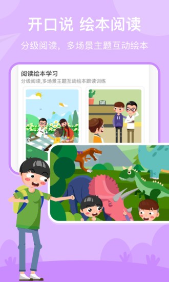 2、阅读绘本学习,分级阅读分年级阅读,多场景主题互动英语绘本跟读训练。