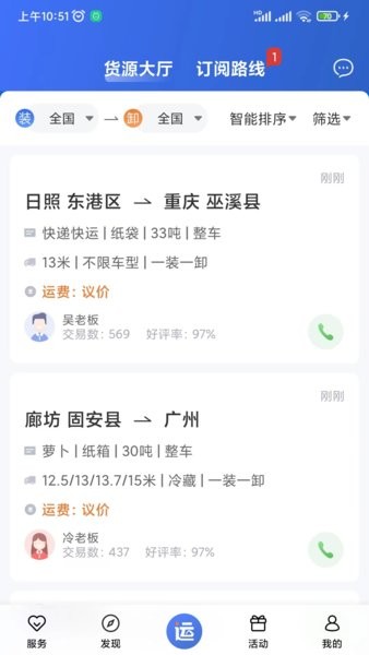 可以在线一键呼叫货主,每个货源订单有货主的快捷联系方式。