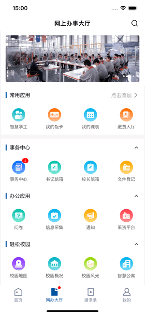 i工大,为师生提供校园应用移动入口,提供智能服务,包含教务、学工、人事、办公、办事、消息、通知等功能。