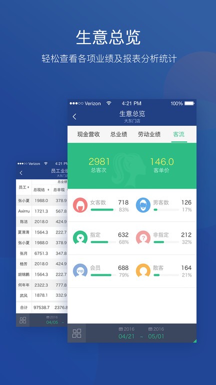 美管加app手机版是专为美业行业打造的店铺管理软件,能够查看每天的客户数量,客单价以及总客次,男客女客占比一目了然,有详细的总业绩以及劳动业绩,能为客户添加档案,进行分类管理,可以查看实时的目标完成进度。
