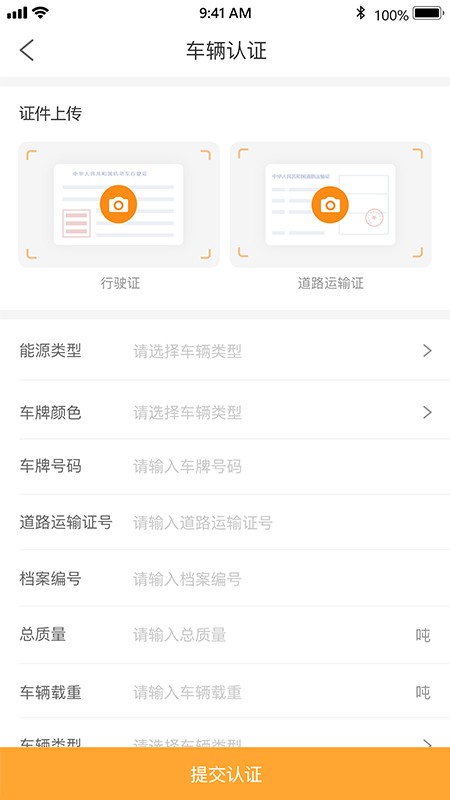 2、证件上传,将个人的行驶证以及运输证等证件拍摄上传即可快速完成审核。
