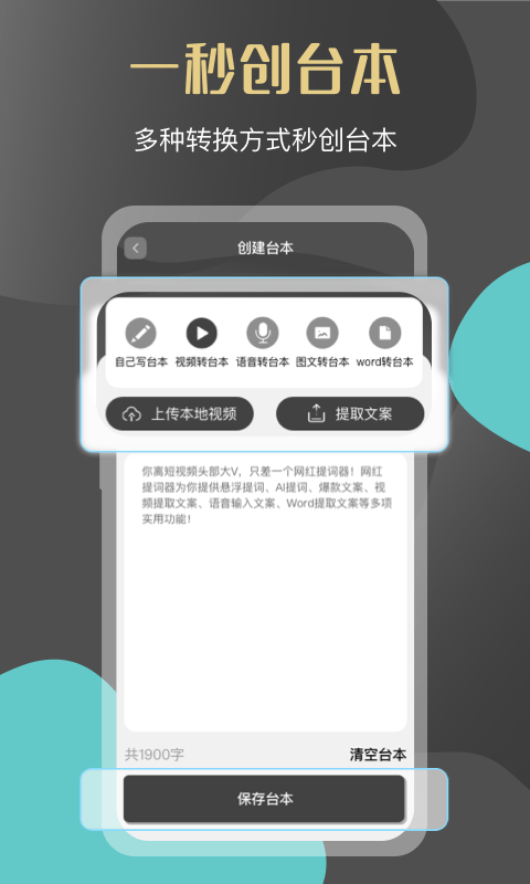 台词字数太长,打字不方便,可以Word / txt 直接导入,视频转台本,链接转台本,图片转台本和语音转台本。解放双手,效率提升90%。