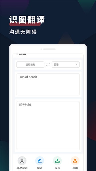 【拍照翻译】可以对拍摄的图片即时翻译,支持多种语言,翻译图片后,可以对识别内容进行编辑,然后再次翻译语言,保存文本