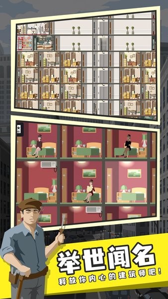 自由的创建自己喜欢的大楼,发挥自己的想象力,玩家在游戏中自由的在大楼中创建喜欢的店面,将它打造成一个最高层的建筑。