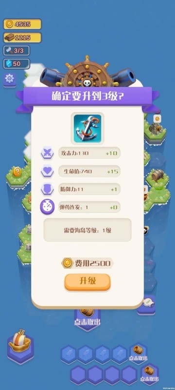 1、冒险骰子与岛屿推图需要门票钱,且图内怪物等级与门票钱都随着船等级提升而提升。
