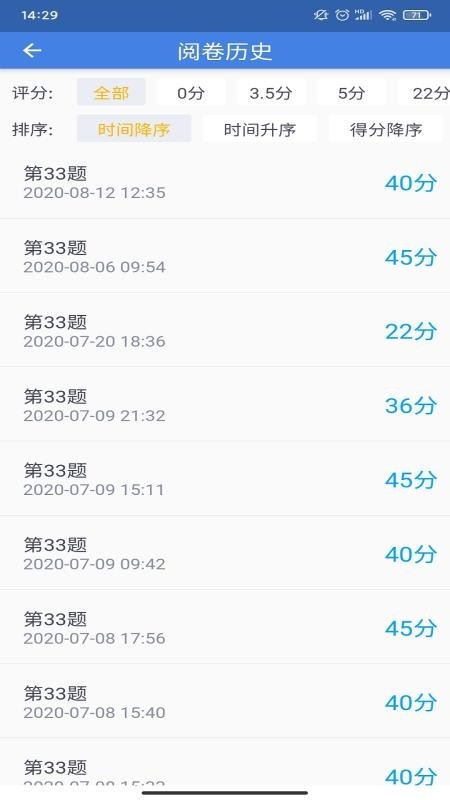 3、在阅卷历史内,可以点击各种排序方式,快速的查看历史