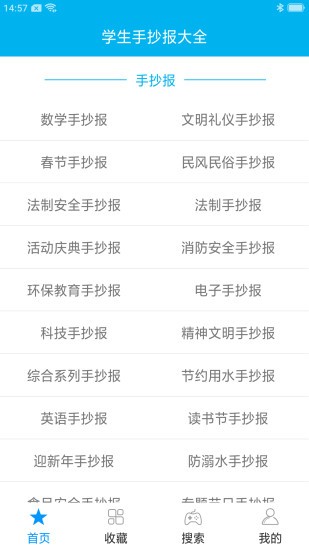 学生手抄报为在校学生意见学前儿童提供丰富的手抄报样板以及解读。同时还包括了各种黑板报,手工等相关的学习知识可供学习。软件中手抄报内容丰富,应有尽有包括了,国庆节手抄报,六一儿童节手抄报,电子手抄报,精神文明手抄报,英语手抄报,季节手抄报,爱国手抄报,数学手抄报,文明礼仪手抄报,节日手抄报,民俗手抄报,消防和环保等各种类型的手抄报。