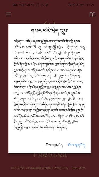 藏学出版社发布的一款为用户提供《东噶藏学大辞典》藏文词条检索服务app,支持藏文、汉文界面,界面美观、采用藏文元素,符合藏文操作习惯,支持藏文小字符集unicode国际标准,内容展现符合藏文排版习惯。