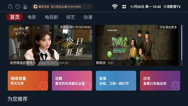 少泽影客电视版是一个全新的大屏影视追剧平台,操作简单又方便,功能超级强大!它聚合了各种影视资源,想看什么都能找到,而且高清流畅,画质超棒。最让我喜欢的是界面设计很人性化,找节目特别容易,还有智能推荐功能,会根据我的观看历史自动推送我喜欢的内容,省时又贴心。安装也很简单,直接用U盘就能搞定,适合装在智能电视或者机顶盒上用。