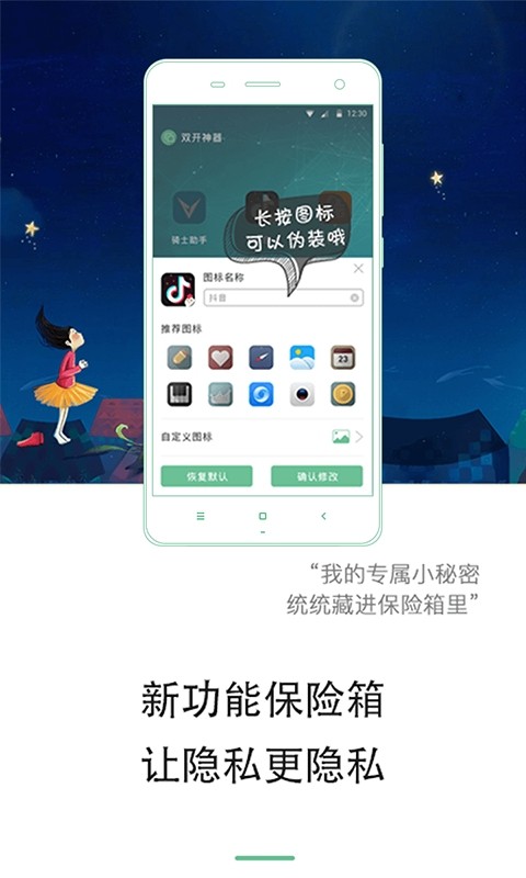 2、分身72变,好看又好记。多开的应用分身,不再是一个图标带不同的数字来区别,你可以自定义分身的图标和名称,分身再也不那么单调了。也可以用来伪装分身,你懂得哦