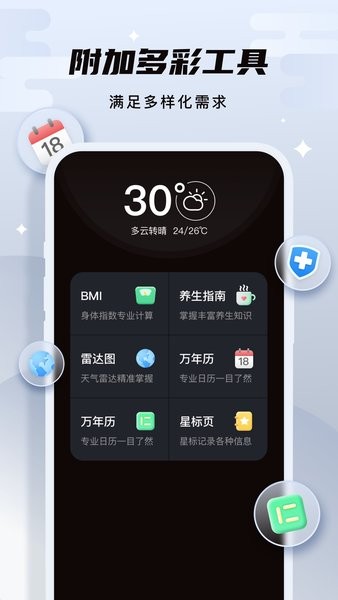 提供手机组件、万年历、雷达云图、bmi计算、养生指南科普等功能,下载白露天气就能拥有工具百宝箱,满足你日常的多种需求;