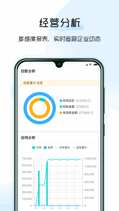 4、进入经营分析版块,查看企业的回款分析和合同分析内容,快速了解企业经营状况