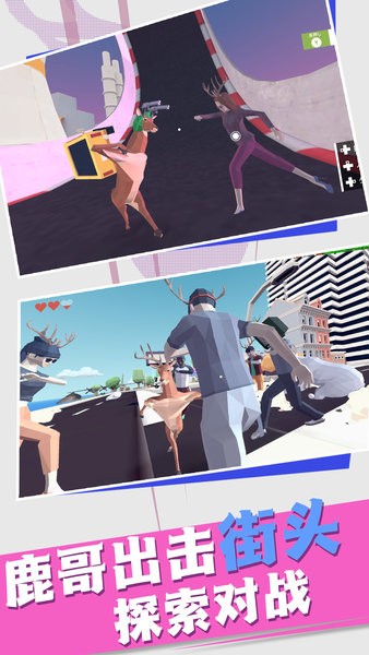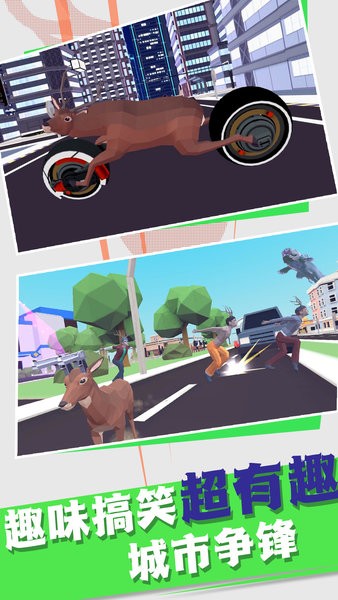 游戏的主角是一只拟人形象的鹿,这个鹿特别喜欢在各种地方捣蛋。你可以去控制这只鹿在城市中展开各种破坏,也能够去武器展开战斗。你能够使用一切可以使用的方法让自己解压,控制你的鹿去把城市给破坏掉吧。