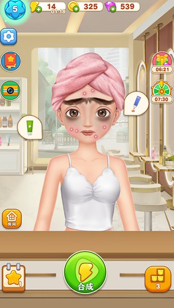 游戏亮点很多,比如自由合成道具系统,通过收集材料合成各种美化的工具和部件;还有家居装饰玩法,把简陋的房间一步步改造成豪宅。特色功能也很丰富,包括美白、化妆、美发等实用功能,以及从头到脚的面部拉皮素颜模拟。